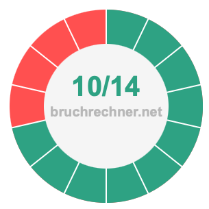 Die beiden nachstehenden Tortendiagramme veranschaulichen, was es bedeutet, 10/14 zu kürzen. Der Zähler und der Nenner des gekürzten Bruchs sind kleiner als der Zähler und der Nenner des ursprünglichen Bruchs, aber die beiden Brüche haben den gleichen Wert.