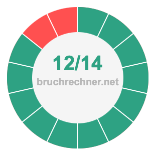 Die beiden nachstehenden Tortendiagramme veranschaulichen, was es bedeutet, 12/14 zu kürzen. Der Zähler und der Nenner des gekürzten Bruchs sind kleiner als der Zähler und der Nenner des ursprünglichen Bruchs, aber die beiden Brüche haben den gleichen Wert.