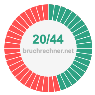 Die beiden nachstehenden Tortendiagramme veranschaulichen, was es bedeutet, 20/44 zu kürzen. Der Zähler und der Nenner des gekürzten Bruchs sind kleiner als der Zähler und der Nenner des ursprünglichen Bruchs, aber die beiden Brüche haben den gleichen Wert.