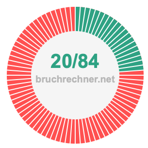 Die beiden nachstehenden Tortendiagramme veranschaulichen, was es bedeutet, 20/84 zu kürzen. Der Zähler und der Nenner des gekürzten Bruchs sind kleiner als der Zähler und der Nenner des ursprünglichen Bruchs, aber die beiden Brüche haben den gleichen Wert.