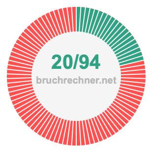 Die beiden nachstehenden Tortendiagramme veranschaulichen, was es bedeutet, 20/94 zu kürzen. Der Zähler und der Nenner des gekürzten Bruchs sind kleiner als der Zähler und der Nenner des ursprünglichen Bruchs, aber die beiden Brüche haben den gleichen Wert.
