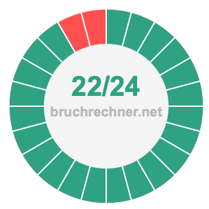 Die beiden nachstehenden Tortendiagramme veranschaulichen, was es bedeutet, 22/24 zu kürzen. Der Zähler und der Nenner des gekürzten Bruchs sind kleiner als der Zähler und der Nenner des ursprünglichen Bruchs, aber die beiden Brüche haben den gleichen Wert.