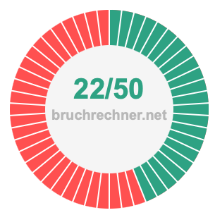Die beiden nachstehenden Tortendiagramme veranschaulichen, was es bedeutet, 22/50 zu kürzen. Der Zähler und der Nenner des gekürzten Bruchs sind kleiner als der Zähler und der Nenner des ursprünglichen Bruchs, aber die beiden Brüche haben den gleichen Wert.