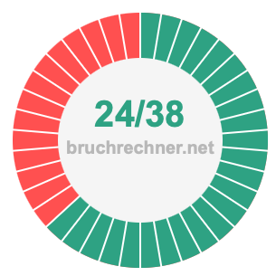 Die beiden nachstehenden Tortendiagramme veranschaulichen, was es bedeutet, 24/38 zu kürzen. Der Zähler und der Nenner des gekürzten Bruchs sind kleiner als der Zähler und der Nenner des ursprünglichen Bruchs, aber die beiden Brüche haben den gleichen Wert.
