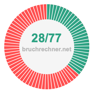 Die beiden nachstehenden Tortendiagramme veranschaulichen, was es bedeutet, 28/77 zu kürzen. Der Zähler und der Nenner des gekürzten Bruchs sind kleiner als der Zähler und der Nenner des ursprünglichen Bruchs, aber die beiden Brüche haben den gleichen Wert.