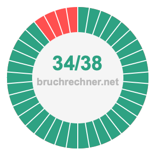 Die beiden nachstehenden Tortendiagramme veranschaulichen, was es bedeutet, 34/38 zu kürzen. Der Zähler und der Nenner des gekürzten Bruchs sind kleiner als der Zähler und der Nenner des ursprünglichen Bruchs, aber die beiden Brüche haben den gleichen Wert.