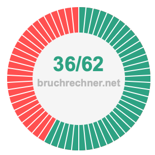 Die beiden nachstehenden Tortendiagramme veranschaulichen, was es bedeutet, 36/62 zu kürzen. Der Zähler und der Nenner des gekürzten Bruchs sind kleiner als der Zähler und der Nenner des ursprünglichen Bruchs, aber die beiden Brüche haben den gleichen Wert.