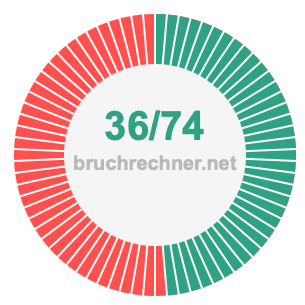 Die beiden nachstehenden Tortendiagramme veranschaulichen, was es bedeutet, 36/74 zu kürzen. Der Zähler und der Nenner des gekürzten Bruchs sind kleiner als der Zähler und der Nenner des ursprünglichen Bruchs, aber die beiden Brüche haben den gleichen Wert.