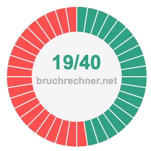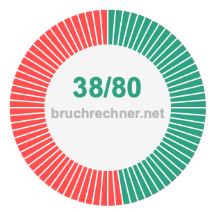 Die beiden nachstehenden Tortendiagramme veranschaulichen, was es bedeutet, 38/80 zu kürzen. Der Zähler und der Nenner des gekürzten Bruchs sind kleiner als der Zähler und der Nenner des ursprünglichen Bruchs, aber die beiden Brüche haben den gleichen Wert.