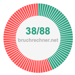 Die beiden nachstehenden Tortendiagramme veranschaulichen, was es bedeutet, 38/88 zu kürzen. Der Zähler und der Nenner des gekürzten Bruchs sind kleiner als der Zähler und der Nenner des ursprünglichen Bruchs, aber die beiden Brüche haben den gleichen Wert.