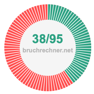 Die beiden nachstehenden Tortendiagramme veranschaulichen, was es bedeutet, 38/95 zu kürzen. Der Zähler und der Nenner des gekürzten Bruchs sind kleiner als der Zähler und der Nenner des ursprünglichen Bruchs, aber die beiden Brüche haben den gleichen Wert.