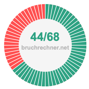 Die beiden nachstehenden Tortendiagramme veranschaulichen, was es bedeutet, 44/68 zu kürzen. Der Zähler und der Nenner des gekürzten Bruchs sind kleiner als der Zähler und der Nenner des ursprünglichen Bruchs, aber die beiden Brüche haben den gleichen Wert.