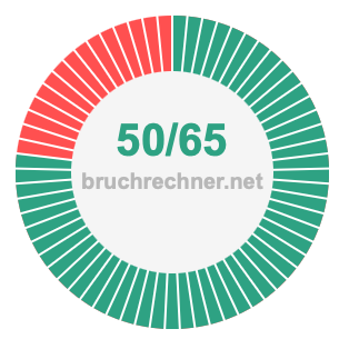 Die beiden nachstehenden Tortendiagramme veranschaulichen, was es bedeutet, 50/65 zu kürzen. Der Zähler und der Nenner des gekürzten Bruchs sind kleiner als der Zähler und der Nenner des ursprünglichen Bruchs, aber die beiden Brüche haben den gleichen Wert.