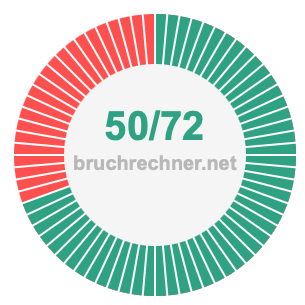 Die beiden nachstehenden Tortendiagramme veranschaulichen, was es bedeutet, 50/72 zu kürzen. Der Zähler und der Nenner des gekürzten Bruchs sind kleiner als der Zähler und der Nenner des ursprünglichen Bruchs, aber die beiden Brüche haben den gleichen Wert.