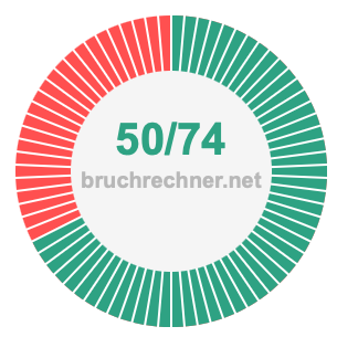 Die beiden nachstehenden Tortendiagramme veranschaulichen, was es bedeutet, 50/74 zu kürzen. Der Zähler und der Nenner des gekürzten Bruchs sind kleiner als der Zähler und der Nenner des ursprünglichen Bruchs, aber die beiden Brüche haben den gleichen Wert.