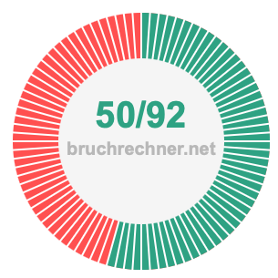 Die beiden nachstehenden Tortendiagramme veranschaulichen, was es bedeutet, 50/92 zu kürzen. Der Zähler und der Nenner des gekürzten Bruchs sind kleiner als der Zähler und der Nenner des ursprünglichen Bruchs, aber die beiden Brüche haben den gleichen Wert.