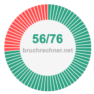 Die beiden nachstehenden Tortendiagramme veranschaulichen, was es bedeutet, 56/76 zu kürzen. Der Zähler und der Nenner des gekürzten Bruchs sind kleiner als der Zähler und der Nenner des ursprünglichen Bruchs, aber die beiden Brüche haben den gleichen Wert.