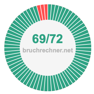 Die beiden nachstehenden Tortendiagramme veranschaulichen, was es bedeutet, 69/72 zu kürzen. Der Zähler und der Nenner des gekürzten Bruchs sind kleiner als der Zähler und der Nenner des ursprünglichen Bruchs, aber die beiden Brüche haben den gleichen Wert.